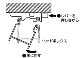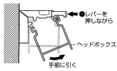 1.取りはずす際は、ブラケットのレバーを押しながらヘッドボックスを奥に押して、本体を仮止めフックからはずしてください。