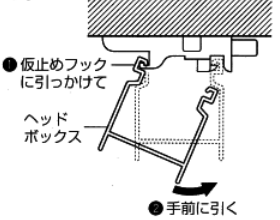2.取り付ける際は、ヘッドボックスをブラインドの仮止めフックに引っかけて、本体を手前にカチッと押し込んでください。