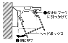 2.取り付ける際は、ヘッドボックスをブラインドの仮止めフックに引っかけて、本体を奥にカチッと押し込んでください。