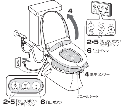 5.着座センサーをふさいだまま、リモコンまたは本体操作部の「おしり」または「ビデ」ボタンを押します。