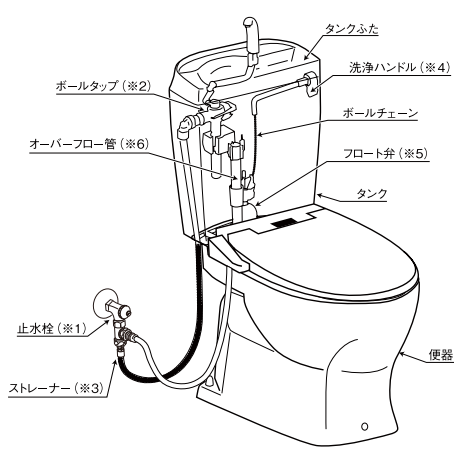 フロート弁と洗浄ハンドルをつなぐボールチェーンが外れていることがあります。タンクの蓋を開けて、ボールチェーンを繋いでください。