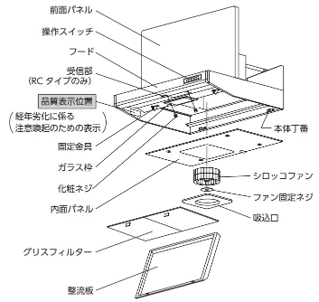 本体各部(前面パネル・ダクトカバー・グリスフィルター・シロッコファン等)が正しく取り付けられているか確認してください。